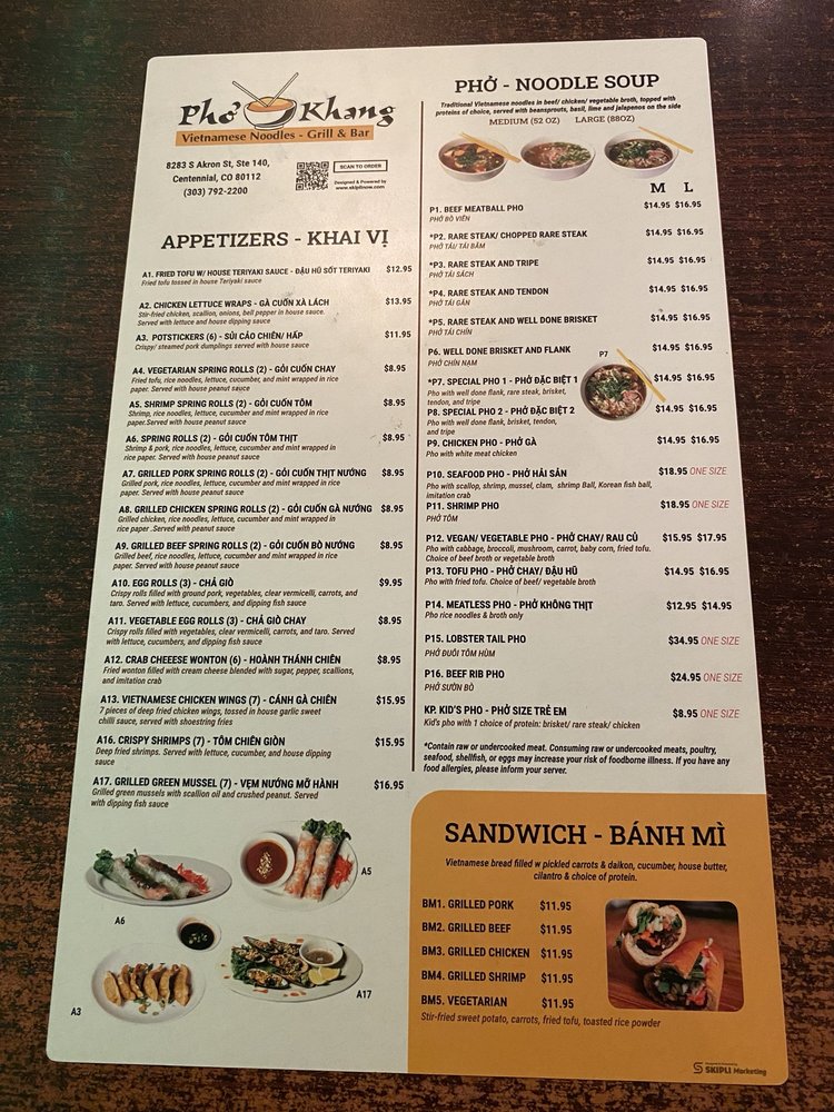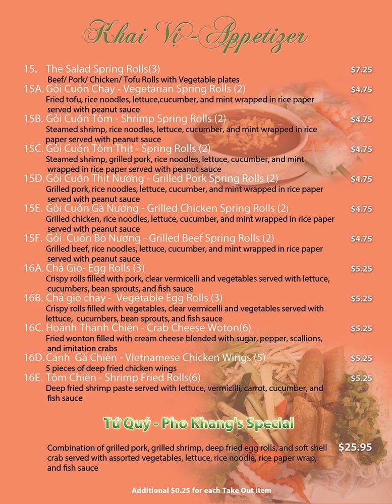 Welcome to Pho Khang, a delightful spot in Centennial, CO, renowned for its authentic Vietnamese cuisine, particularly its tantalizing noodle dishes. Their menu proudly features a range of dishes that celebrate the rich, aromatic flavors of traditional Vietnamese cooking.